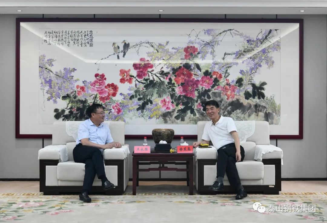 9月20日上午,日照市财金投资集团、齐鲁财金投资集团客人们来泰山钢铁集团交流。在办公楼贵宾室,泰山钢铁集团党委书记、董事长王永胜与日照市财金投资集团党委书记、董事长徐东高等领导进行了座谈交流。