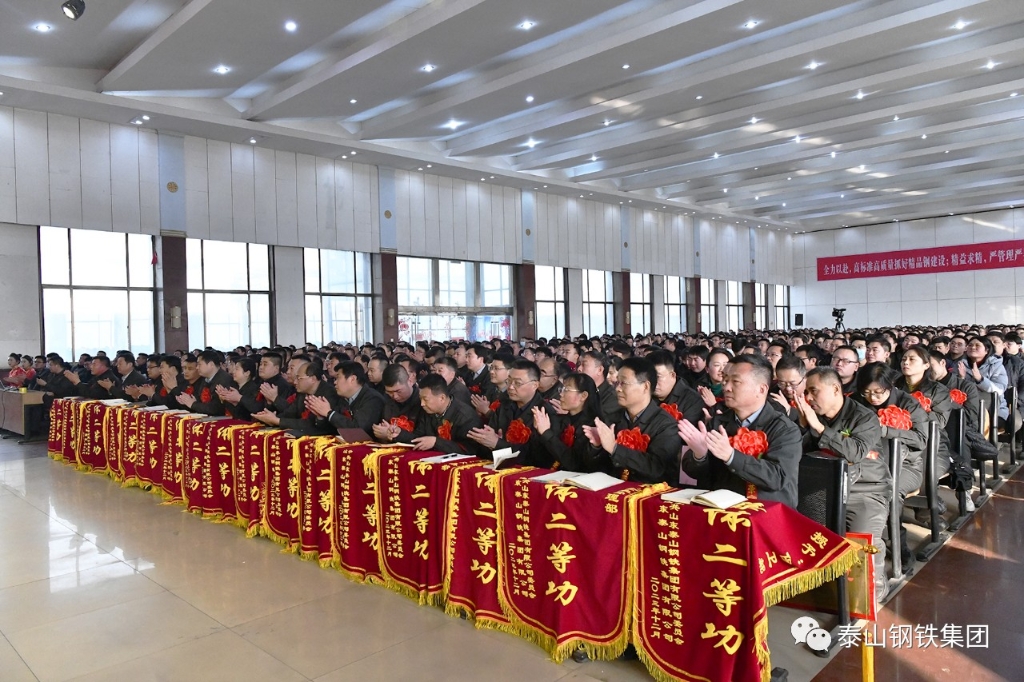 今天的中心会堂气氛庄重热烈,主席台上方悬挂着“山东泰山钢铁集团有限公司2023年度总结表彰大会”的会标,帷幕正中的厂标在鲜艳的红旗映衬下熠熠生辉。