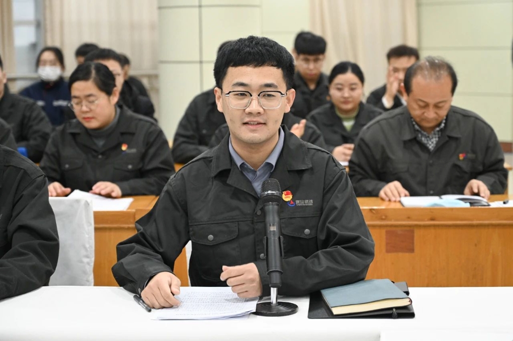 会上,集团不锈钢事业部党支部书记王慧、泰嘉新材料冷退作业区副主管刘明、冷轧部2#1700轧制机组机长胡吉峰、环保部环保管理员侯星兵依次发言。